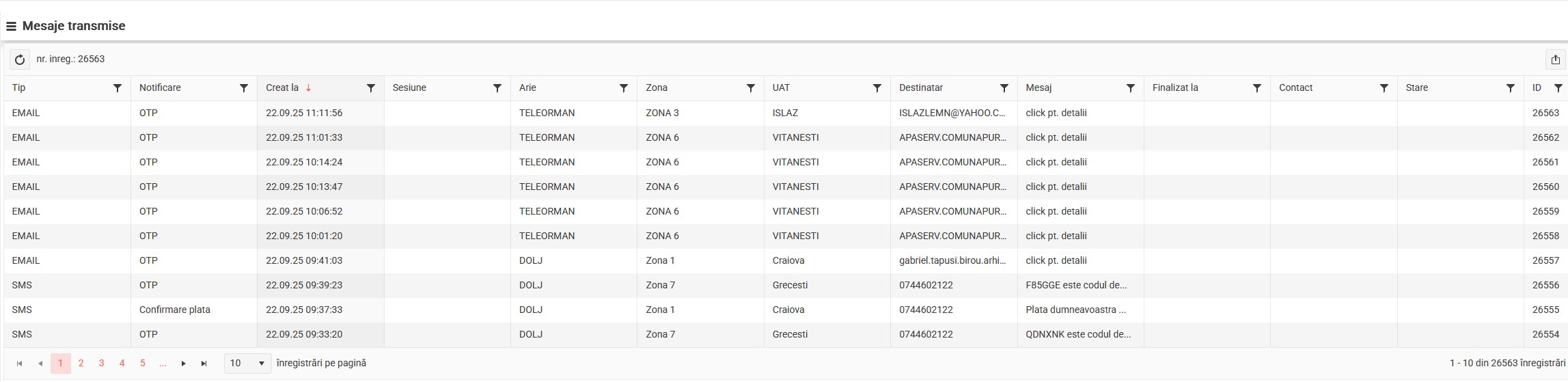 Acest panou permite vizualizarea, filtrarea, ordonarea si exportul tuturor mesajelor transmise. Functia de export in format excel permite generarea ulterioara a rapoartelor necesare in functie de necesitate.